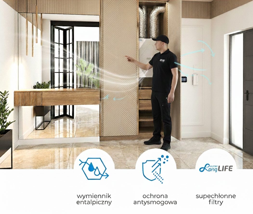 Przy ogrzewaniu podłogowym odpowiednia wilgotność to podstawa. Gdy powietrze jest zbyt suche, kurz staje się lekki i unosi się w górę. Dzięki rekuperacji entalpicznej SHS, wilgotne powietrze dociąża kurz, który osiada na podłodze, zamiast trafiać do Twoich płuc.